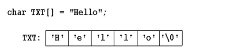 Durante la inicialización, la computadora reserva automáticamente el número de bytes necesarios para la cadena, esto es, el número de caracteres más uno (aquí: 6 caracteres).