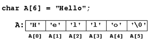 char cadena[] = "Hello";Nosotros podemos acceder al primer componente del arreglo por medio de: dias[0], al segundo elemento por: dias[1] y al último elemento por dias[11].